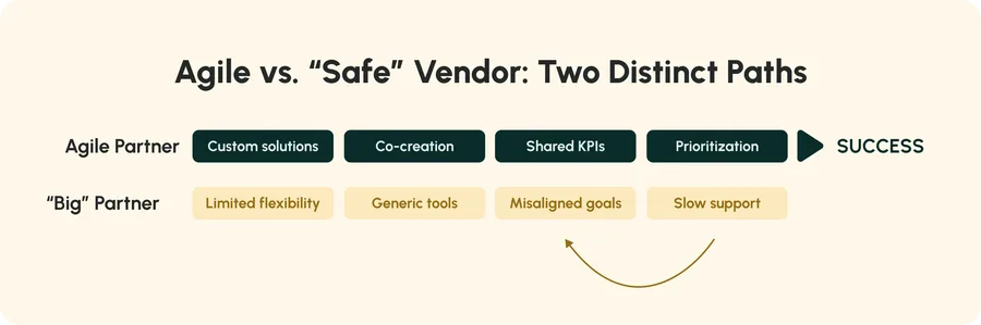 By choosing a smaller vendor as a partner, you have the opportunity to be one of their most important customers, and shape their product roadmap in line with your business needs. Agility, trust, and partnership can trump the primary qualities of larger organizations, such as scale, tenure, and theater (“looking the part”).
