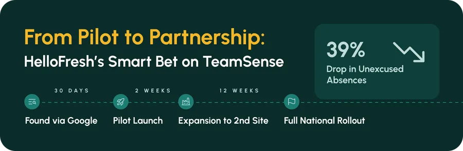 TeamSense launched their attendance tool at a single plant in the NY/NJ area. Two weeks in, the pilot was going so well that HelloFresh asked to add another site. At the end of the pilot they agreed to a national rollout.