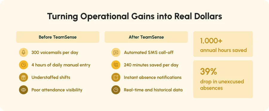 For example, TeamSense’s solution can increase visibility around attendance, cut downtime, and measurably reduce absentee rates. But how does that translate into dollars saved or earned?